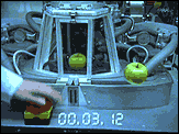 Experiment 1: Da man einen Apfel um vier Sekunden in die Vergangenheit versetzt, erscheint er für kurze Zeit ein zweites Mal im Labor, als der Bediener die Maschine betätigt. Und zwar materialisiert der Apfel leicht ortsvesetzt.